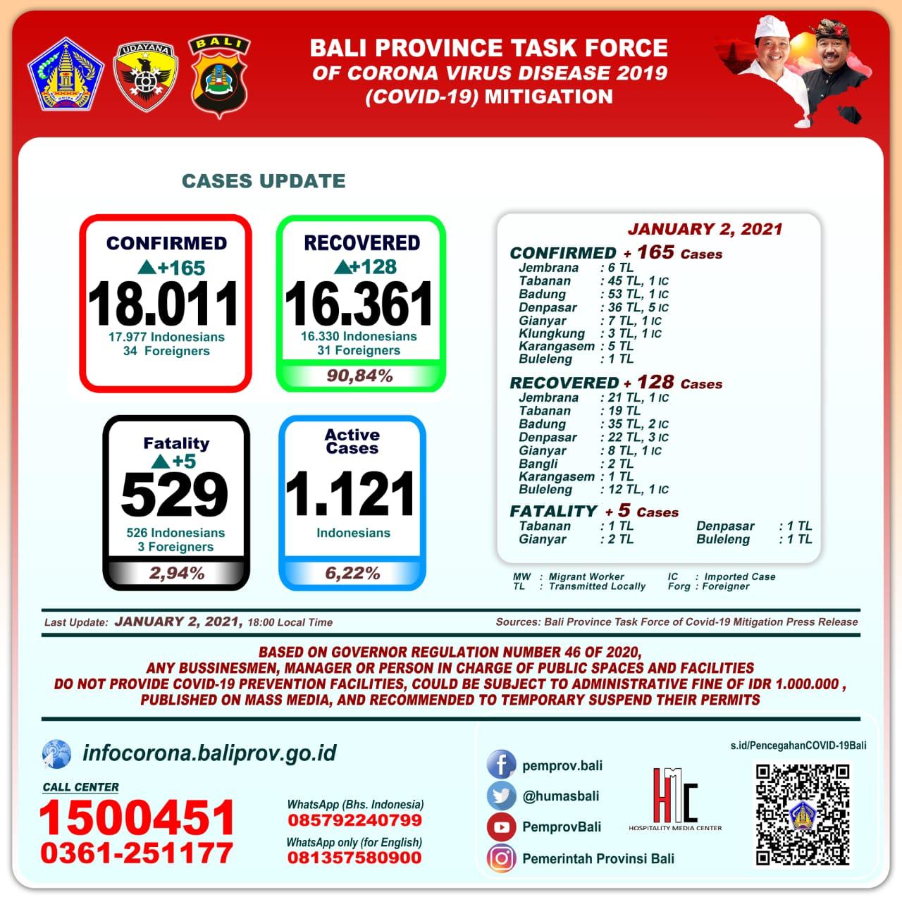 Dengan adanya penambahan tersebut maka secara kumulatif jumlah terkonfirmasi positif menjadi 18.011 orang, sembuh 16.361 orang (90,84%), dan meninggal dunia 529 orang (2,94%).