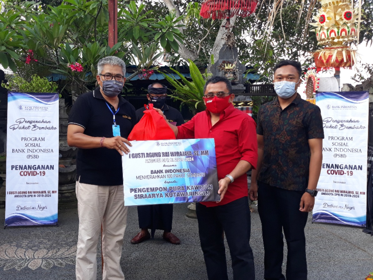 BALI – Bank Indonesia melalui Program Sosial Bank Indonesia (PSBI) bersama Anggota DPR RI Komisi XI, I Gusti Agung Rai Wirajaya, kembali menyalurkan 1.100 paket sembako bagi masyarakat terdampak Covid-19 di kediamannya Jero Prenem Jl. Suradipa Peguyangan, Denpasar, Sabtu (3/10/2020) sore.