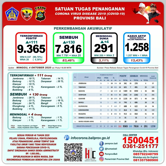 CHANNELBALI Denpasar | Perkembangan Pandemi Covid-19 di Provinsi Bali, Minggu 4/10/2020 Mencatat pertambahan kasus : TERKONFIRMASI sebanyak 111 orang melalui Transmisi Lokal, SEMBUH sebanyak 130 orang, dan