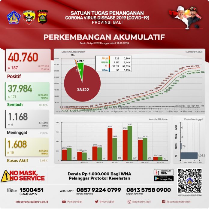 BALI – Update penanggulangan Covid-19 di Bali, Senin (5/3/2021) menunjukkan persentase Sembuh mencapai 37.984 orang (93,19%). Data akumulatif tersebut juga menyebutkan jumlah kasus terkonfirmasi Positif sebanyak 40.760 orang, dan Meninggal Dunia 1.168 orang (2,87%).