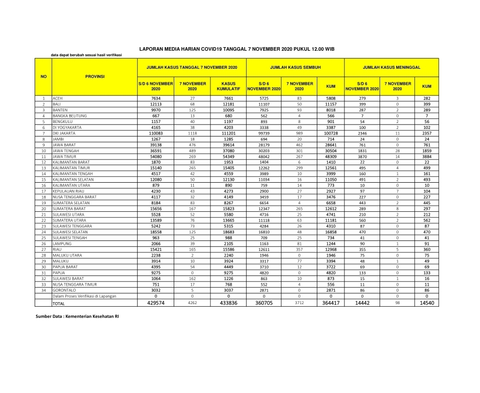 Pda Sabtu, 7 November Gugus Tugas Penanggulangan Covid-19 Provinsi Bali menyampaikan data pasien positif terpapar Covid-19 adalah 68 orang, sehingga secara akumulatif menjadi 12.181 orang yang terdiri dari 12.151 WNI & 30 WNA. Sementara pasien sembuh sebanyak 50 orang, sehingga menjadi 11.157 orang, yaitu 11.131 WNI dan 26 WNA. Pasien Meninggal tercatat nihil, sehingga tetap pada angka sebelumnya yakni 399 Orang yang terdiri dari 396 WNI dan 3 WNA). Pasien yang masih dalam perawatan hingga Sabtu, & November 2020 adalah sebanyak 625 Orang seluruhnya WNI.