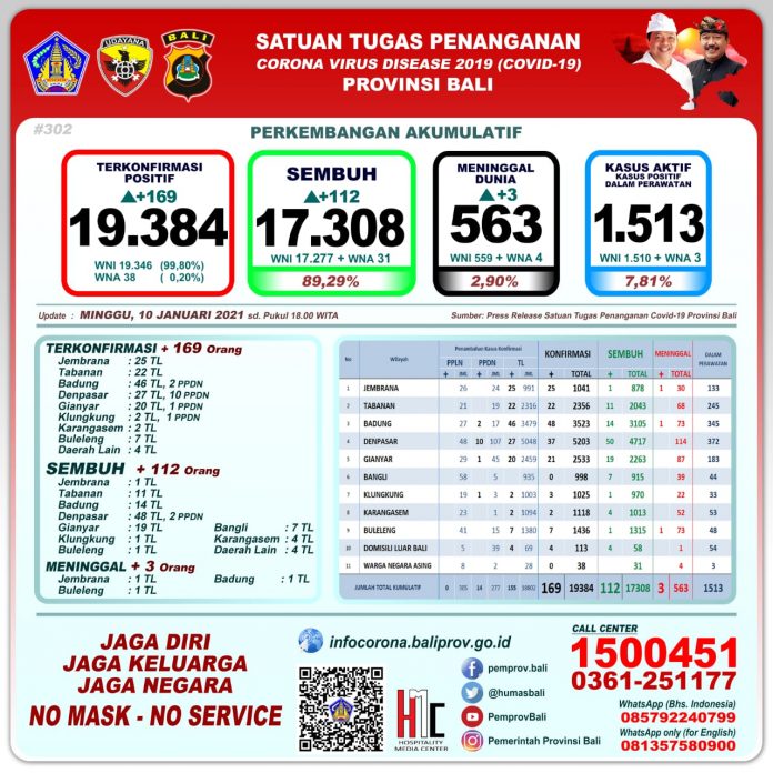 BALI, PERSPECTIVESNEWS – Perkembangan pandemi Covid-19 di Provinsi Bali, Minggu (10/1/2021) mencatat, transmisi lokal tetap mendominasi kasus terkonfirmasi positif Covid-19.