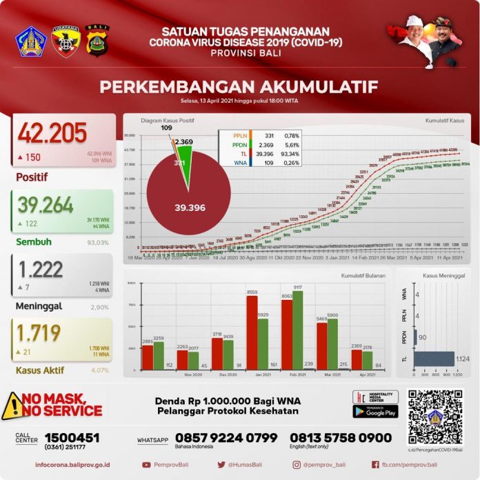 BALI – Tren grafik kasus Covid-19 di Bali masih mengalami instabilitas. Per Selasa (13/4/2021) tercatat kasus terkonfirmasi positif Covid-19 sebanyak 150 orang, menurun 19 orang dibanding sehari sebelumnya.