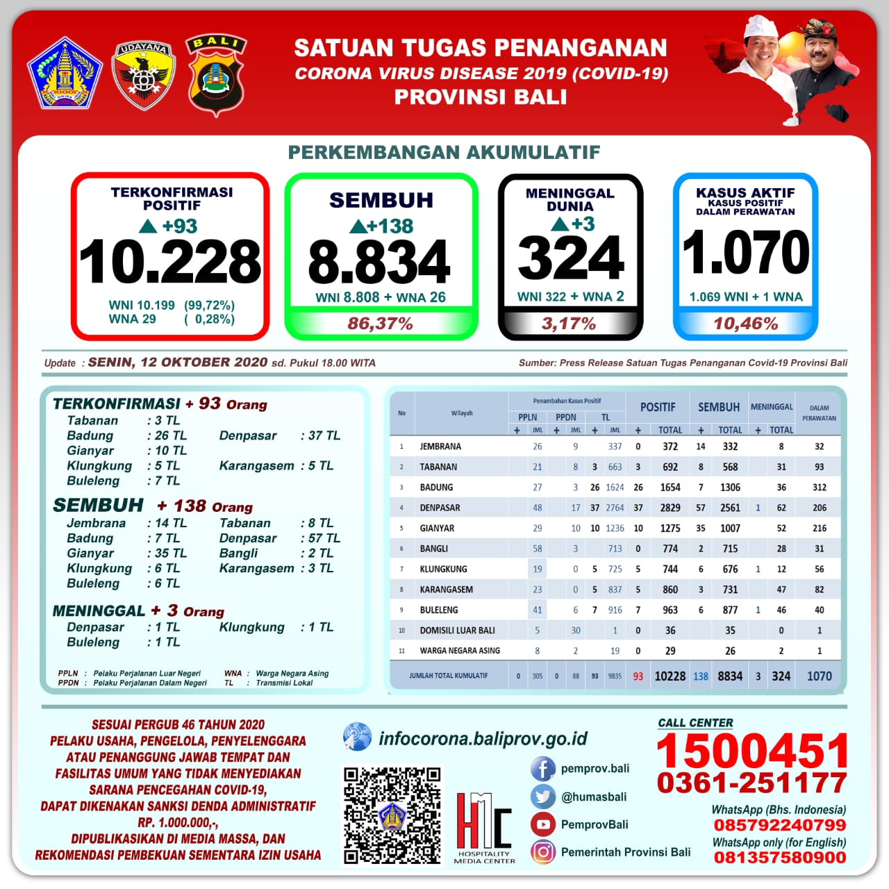 Sesuai Instruksi Presiden No. 6 Tahun 2020, Gubernur Bali mengeluarkan Pergub No. 46 Tahun 2020, yang mengatur tentang sanksi administratif bagi pelanggar Protokol Kesehatan. Besaran denda adalah Rp 100.000 bagi perorangan, dan Rp 1.000.000 bagi pelaku usaha dan tempat fasilitas umum lainnya.