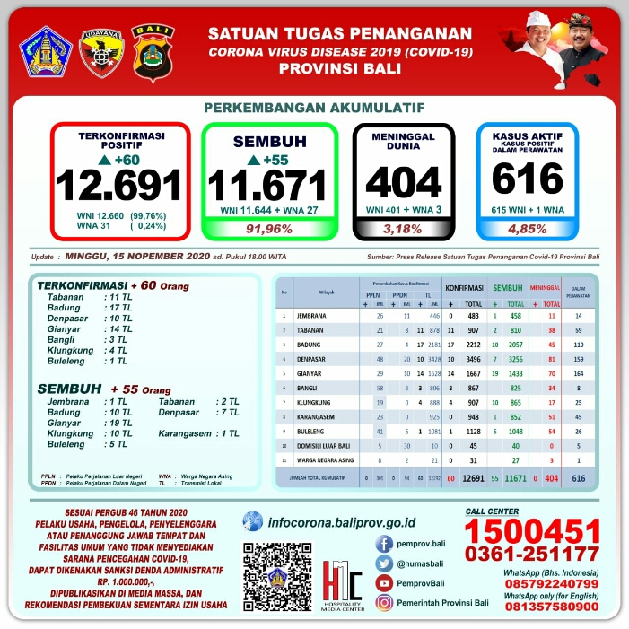 CHANNELBALI Denpasar | Perkembangan Pandemi Covid-19 di Provinsi Bali, Senin 16/11/2020 mencatat pertambahan kasus, terkonfirmasi sebanyak 60 orang melalui Transmisi Lokal Sembuh sebanyak 55 orang, dan Meninggal Dunia Nihil.