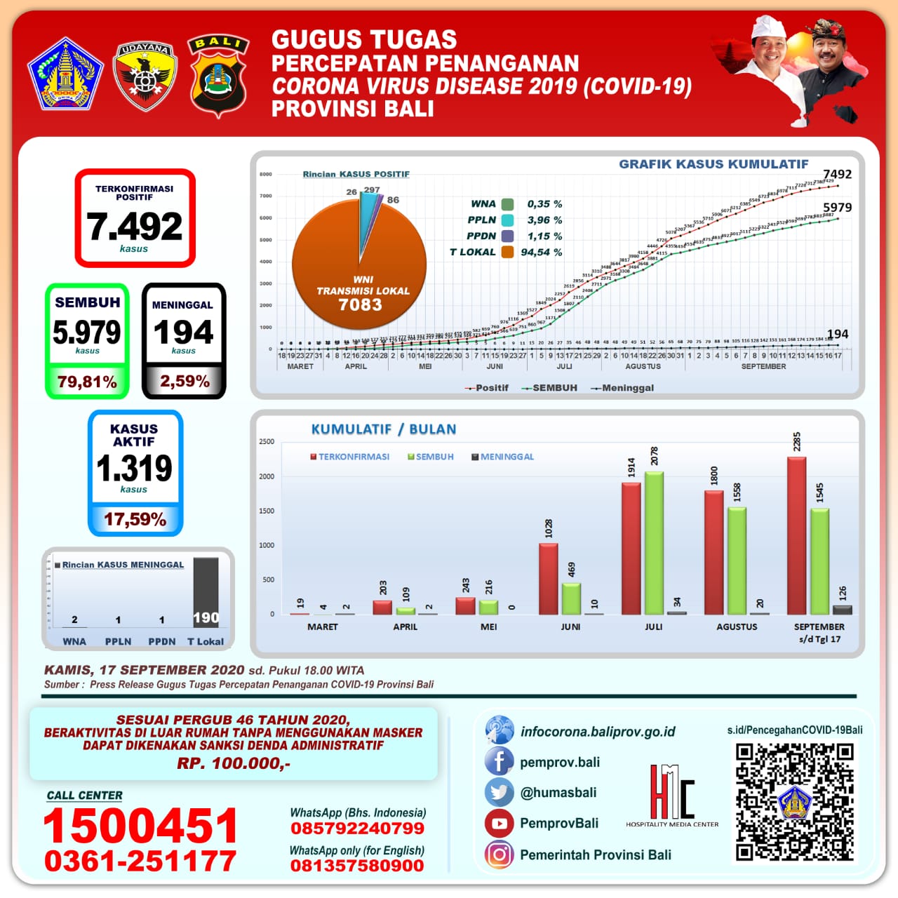 “Hari ini terdapat penambahan sejumlah 63 orang, sehingga secara kumulatif terkonfirmasi positif Covid-19 di Bali menjadi  7.492 orang, pasien sembuh bertambah 92 orang sehingga total menjadi 5.979 orang sembuh atau 79,81%,” ucap Ketua Harian Gugus Tugas Percepatan Penanganan Covid-19 Provinsi Bali Dewa Made Indra, Kamis, 17 September 2020.