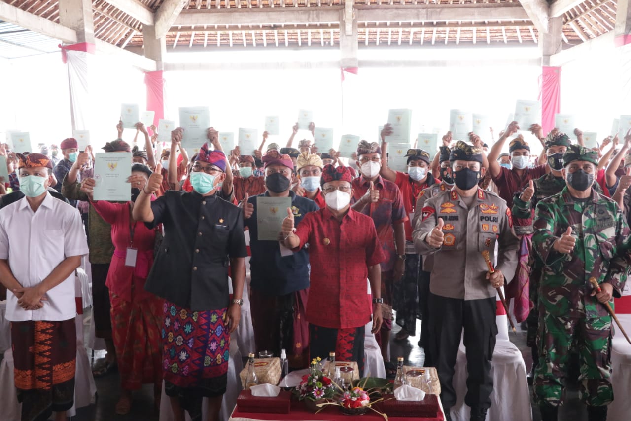 BALI – Gubernur Bali Wayan Koster menyerahkan sertifikat hak milik tanah kepada warga Desa Sumberklampok, Kecamatan Gerokgak, Kabupaten Buleleng pada Selasa (18/5/2021).