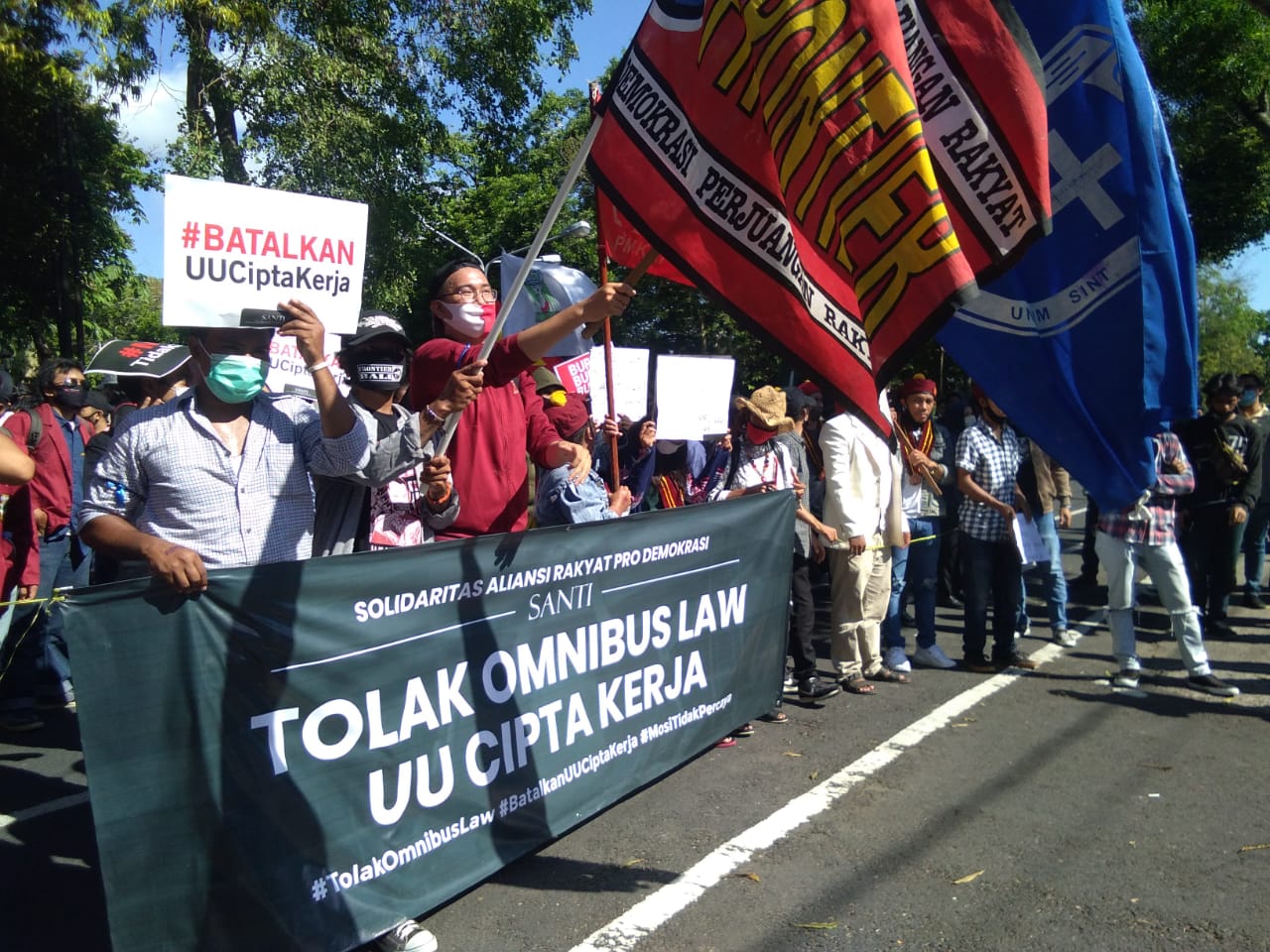 Sekelompok mahasiswa dan masyarakat Bali yang tergabung dalam aliansi Solidaritas Aliansi Rakyat Pro Demokrasi (SANTI) melakukan unjuk rasa atas penolakan disahkannya Omnibus Law RUU Cipta Kerja menjadi Undang-Undang dalam rapat paripurna DPR RI. SANTI menggelar unjuk rasa mulai dari Parkir Timur Lapangan Puputan Margarana Renon dan long march menuju Kantor DPRD Provinsi Bali, Jumat, 16 Oktober 2020.