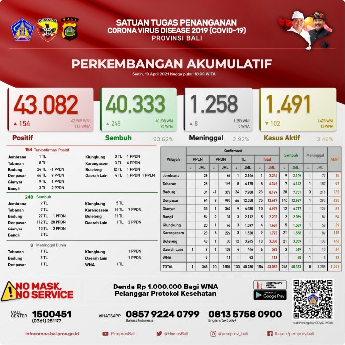 BALI – Perkembangan kasus Covid-19 di Bali menunjukkan angka pasien sembuh terus bertambah. Pada Senin (19/4/2021), pasien sembuh sebanyak 248 orang, terkonfirmasi positif 154 orang (132 orang melalui transmisi lokal, 21 PPDN dan 1 PPLN) dan 8 orang meninggal dunia.
