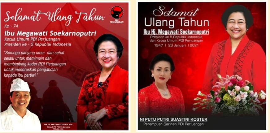 Demikian pula istri Gubernur, Nyonya Putri Suastini Koster juga menuliskan ucapan yang hampir serupa. Flyer ucapan selama tersebut disebar pada Sabtu 23 Januari 2021 di seluruh platform media, baik mainstream maupun media sosial, bertepatan dengan hari peringatan kelahiran ketua Umum PDIP, Megawati Soekarno Putri.