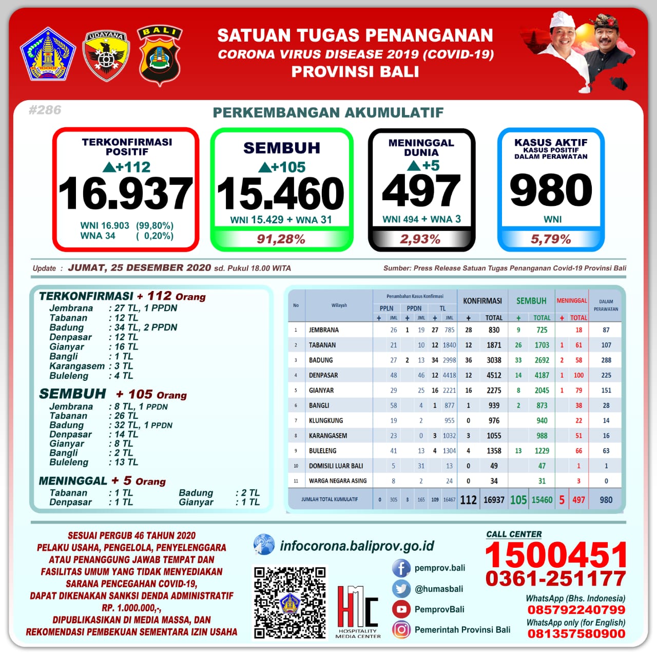 BALI, PERSPECTIVESNEWS Satgas Penanganan Covid-19 Provinsi Bali mencatat hari Jumat (25/12/2020) ada penambahan pasien Covid-19 meninggal dunia sebanyak 5 orang, sedangkan yang sembuh 105 orang dan terkonfirmasi positif bertambah 112 orang.