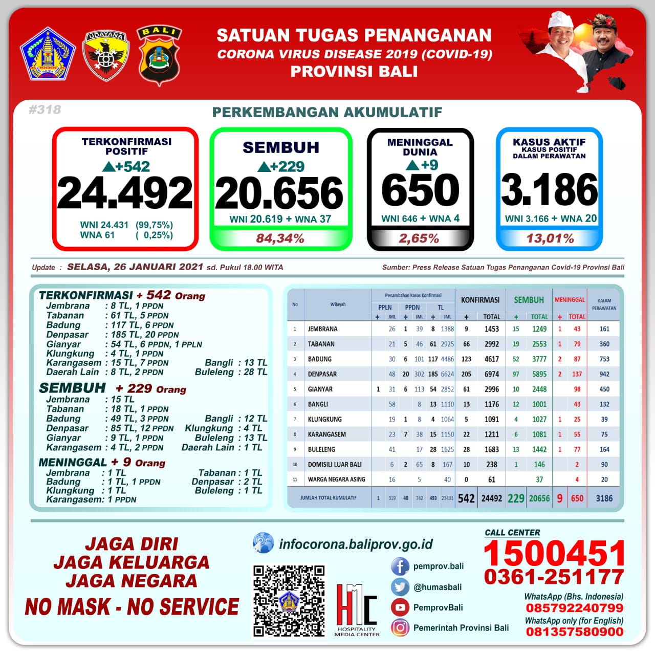 BALI, SIBERINDO.CO – Perkembangan pandemi Covid-19 di Provinsi Bali pada Selasa (26/1/2021) menyentuh angka 542 orang terkonfirmasi Positif, tertinggi selama ini. Jumlah tersebut terdiri 493 orang melalui Transmisi Lokal, 48 PPDN dan 1 PPLN, sementara Sembuh 229 orang, dan 9 orang Meninggal Dunia.