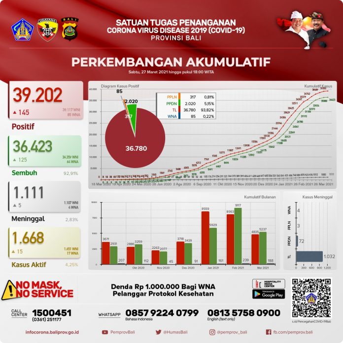 BALI, SIBERINDO.CO – Update penanggulangan Covid-19 di Bali pada Sabtu (27/3/2021) menyebutkan kasus terkonfirmasi positif masih lebih banyak dibandingkan yang sembuh.