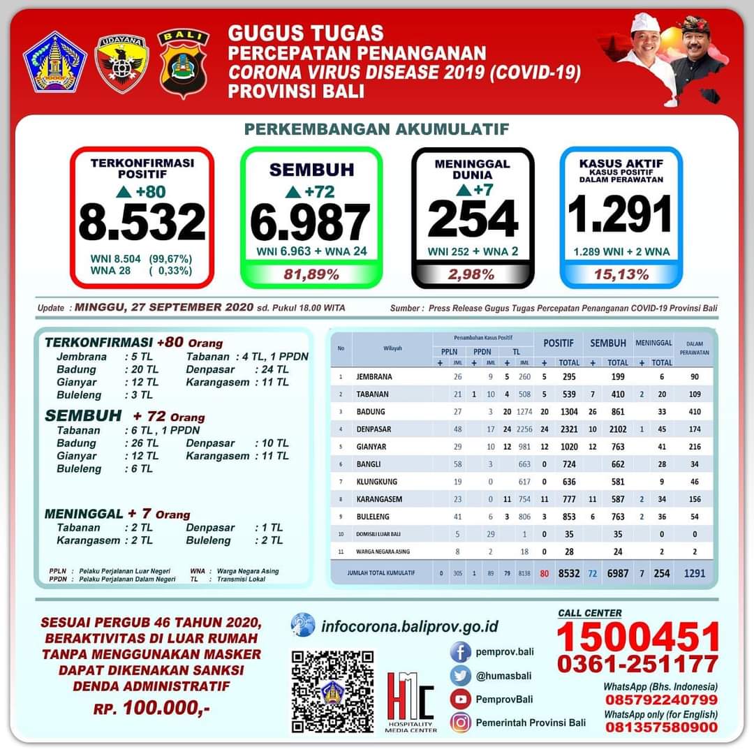 DENPASAR – Jumlah pasien Covid-19 di Bali yang berhasil sembuh secara kumulatif hingga hari Minggu, 27 September 2020 sebanyak 6.987 orang atau 81,89 persen setelah pada hari ini terdapat tambahan pasien sembuh sebanyak 72 orang.