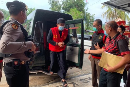 Perbekel Desa Tianyar Barat, I Gede Agung Pasrisak Juliawan turun dari mobil tahanan Kejari Karangasem untuk ditahan di Lapas Karangasem