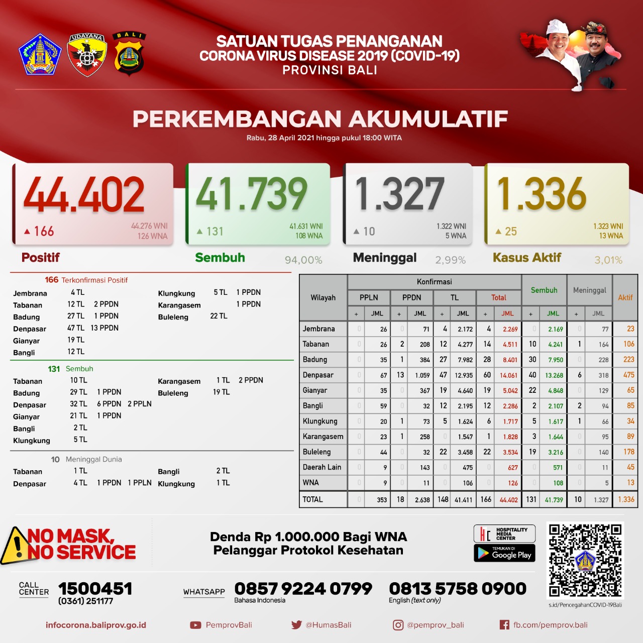 Satgas Penanganan Covid-19 Provinsi Bali mengupdate data pada hari terdapat tambahan 166 orang terkonfirmasi positif terdiri atas 148 orang melalui transmisi lokal dan 18 orang pelaku perjalanan dalam negeri (PPDN).