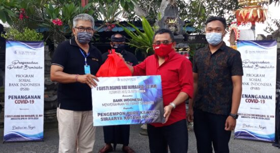Anggota DPR RI Komisi XI, I Gusti Agung Rai Wirajaya menyalurkan sembako Program Sosial Bank Indonesia.     BALI – Bank Indonesia