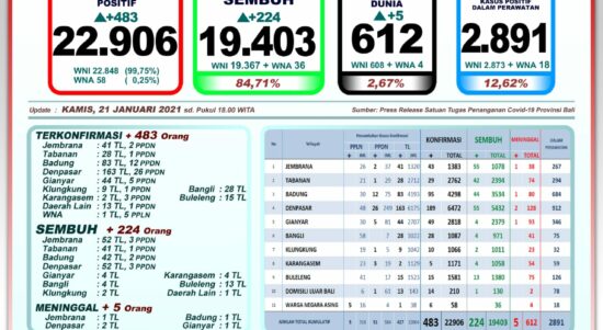 BADUNGNEWS SIBERINDO – Perkembangan pandemi Covid-19 di Provinsi Bali per hari ini (Kamis 21 Januari 2021) masih mencatat angka pertambahan kasus pasien